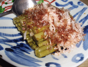 ![]() 東北地方ではおなじみの山菜「あいこ」。私は初めていただきました。正式和名は「ミヤマイラクサ」と言うそうですが、刺草の字の通り、鋭い刺があって採るのは大変なのだそうですが、湯がくと不思議と刺が無くなるとか。シャキシャキとした感触がおいしい山菜でした |