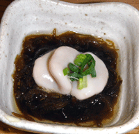 ![]() 小鉢「蒸し馬鈴薯」。赤いのが酒盗で、この塩っ気が酒飲みには堪りませんでした。新たな“ポテサラ”と言っても良い! |
