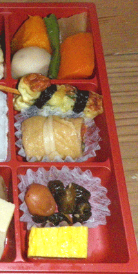 食事は、女性陣が担当、仕事のある平日ということで買出しもままならず、ネットでのケータリング作戦を展開。最もおいしそうなお弁当屋さん「惣介」を指名。無理を言ってこの日オリジナルで、御飯モノを1枡に減らしてその分、酒の肴になるおかずをたっぷり詰めてもらいました。かなり美味しくいただけました! |